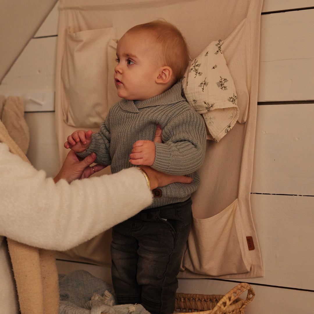 Koude dagen vragen om een warme trui! Deze gebreide trui in een zachte blauwe kleur is een echte musthave voor het najaar. De stoere sjaalkraag geeft een speelse twist aan de jongens trui. Gemaakt van heerlijk zacht materiaal, perfect om je kleintje warm en comfy te houden.