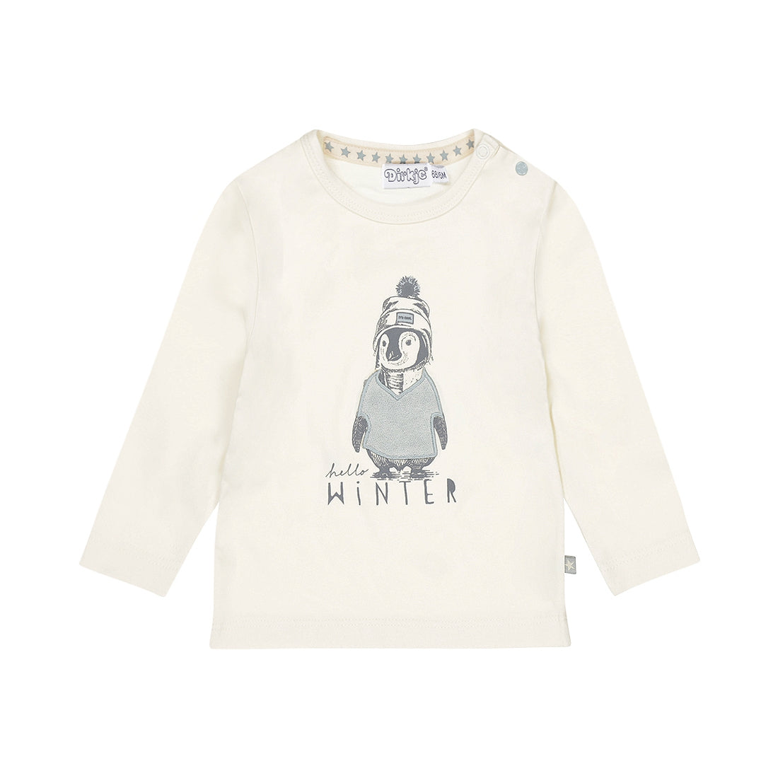 Hello winter! Deze off white longsleeve is perfect voor de koudere dagen. Het jongens shirt met lange mouwen is gemaakt van zachte katoen met stretch, waardoor hij lekker meebeweegt. Op de voorkant staat een schattige pinguïn die helemaal klaar is voor het winterseizoen.