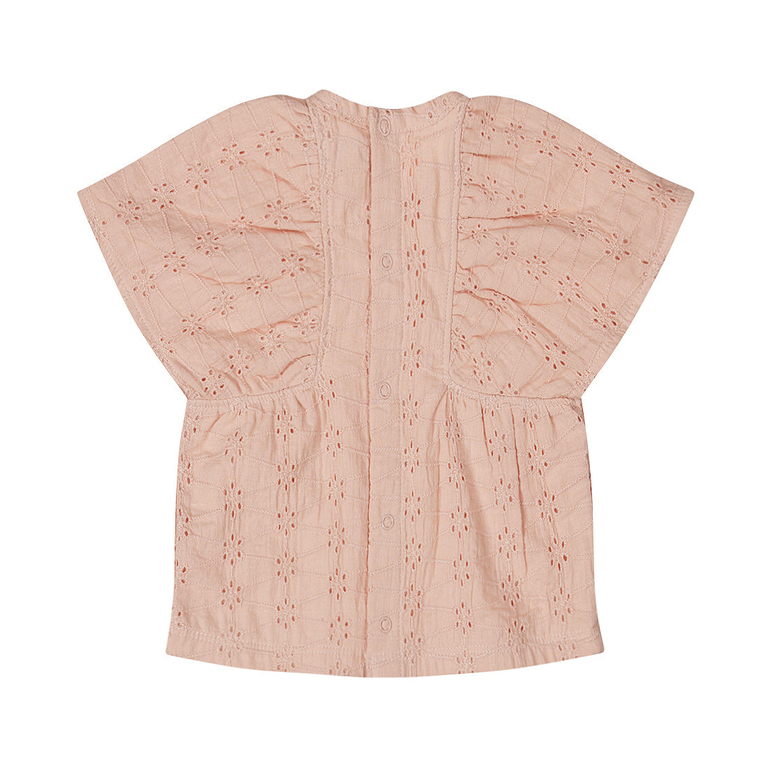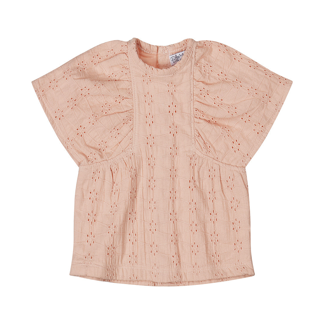 Deze schattige blouse in een zachte, koraalroze tint is perfect voor warme dagen. Het luchtige katoen met broderie voelt heerlijk zacht aan op de huid en geeft de blouse een romantische uitstraling. De pofmouwtjes en de drukkers op de achterzijde maken het helemaal af. Combineer deze meisjes blouse met een rokje of een vrolijke short voor een mooie zomerse look.