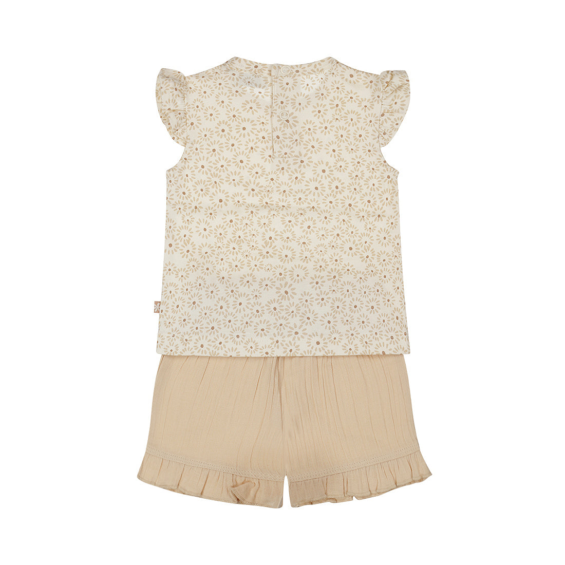 De set bestaat uit een mouwloze top en bijpassende shorts, beide ontworpen met oog voor comfort en stijl. Het shirt zonder mouwen heeft een lief printje en charmante ruffles die over de schouders lopen. De bijpassende beige korte broek is gemaakt van 100% katoen en heeft een elastische tailleband voor een comfortabele pasvorm. De ruffles aan de pijpjes voegen een extra schattig detail toe aan de outfit.