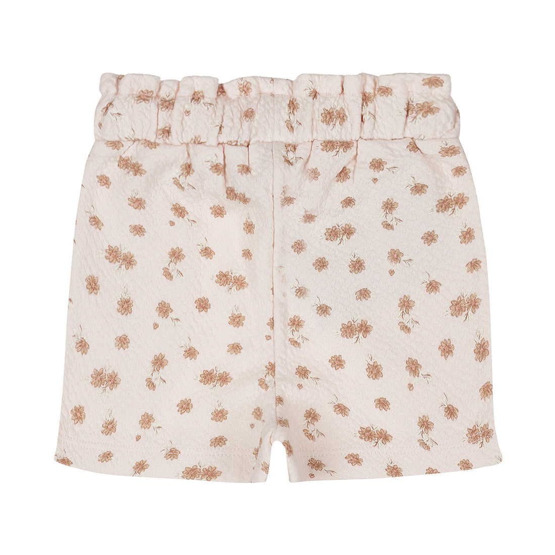 Ontdek de schattigste shorts voor je kleine meid! Deze Dirkje shorts in lichtroze met een lieflijk bloemenprintje is perfect voor warme dagen. De elastische tailleband met een grote strik zorgt voor een comfortabele pasvorm en een speelse touch. Het structuurtje in de stof maakt deze korte broek voor meisjes extra leuk. Ideaal voor een speeldate, vakantie of gewoon lekker thuis.