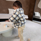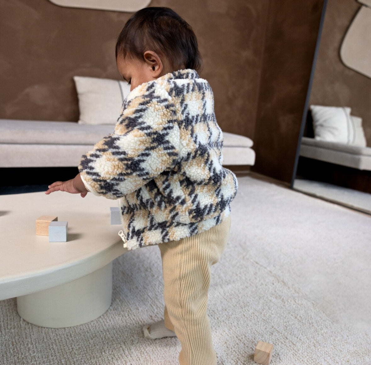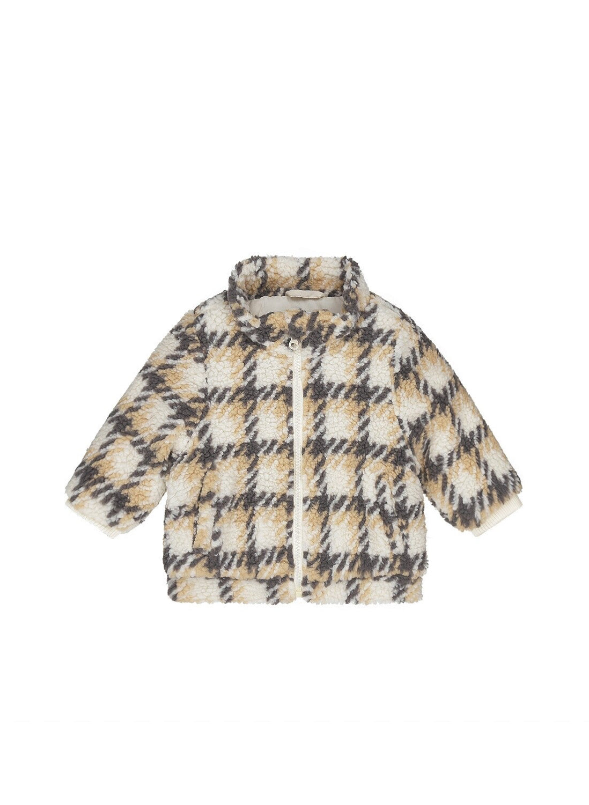 Koude neusjes, warme harten. Dit leuke jasje van Dirkje houdt je kleintje lekker warm. De jas is gevoerd en heeft een fijne boord aan de mouw dus hij is ook geschikt voor koude dagen. Het teddy jasje is gemaakt van een hippe teddy stof en is off white met een bruin en zandkleur geruit motief.Het meisjes jasje heeft een opstaand kraagje en wordt gesloten met een rits.