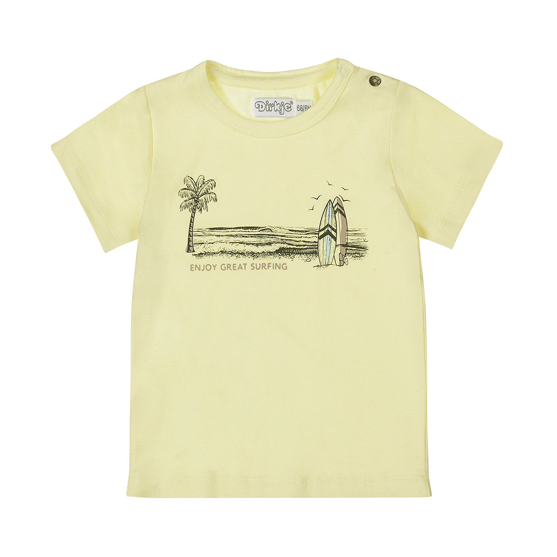 Dit pastel gele Dirkje T-shirt is perfect voor een vrolijke zonnige dag. Gemaakt van zacht katoen met stretch, is dit shirt heerlijk comfortabel voor je kleine man. De "Enjoy Great Surfing" print geeft het jongens shirt met korte mouwen een speelse en zonnige uitstraling, perfect voor heerlijke summer days.