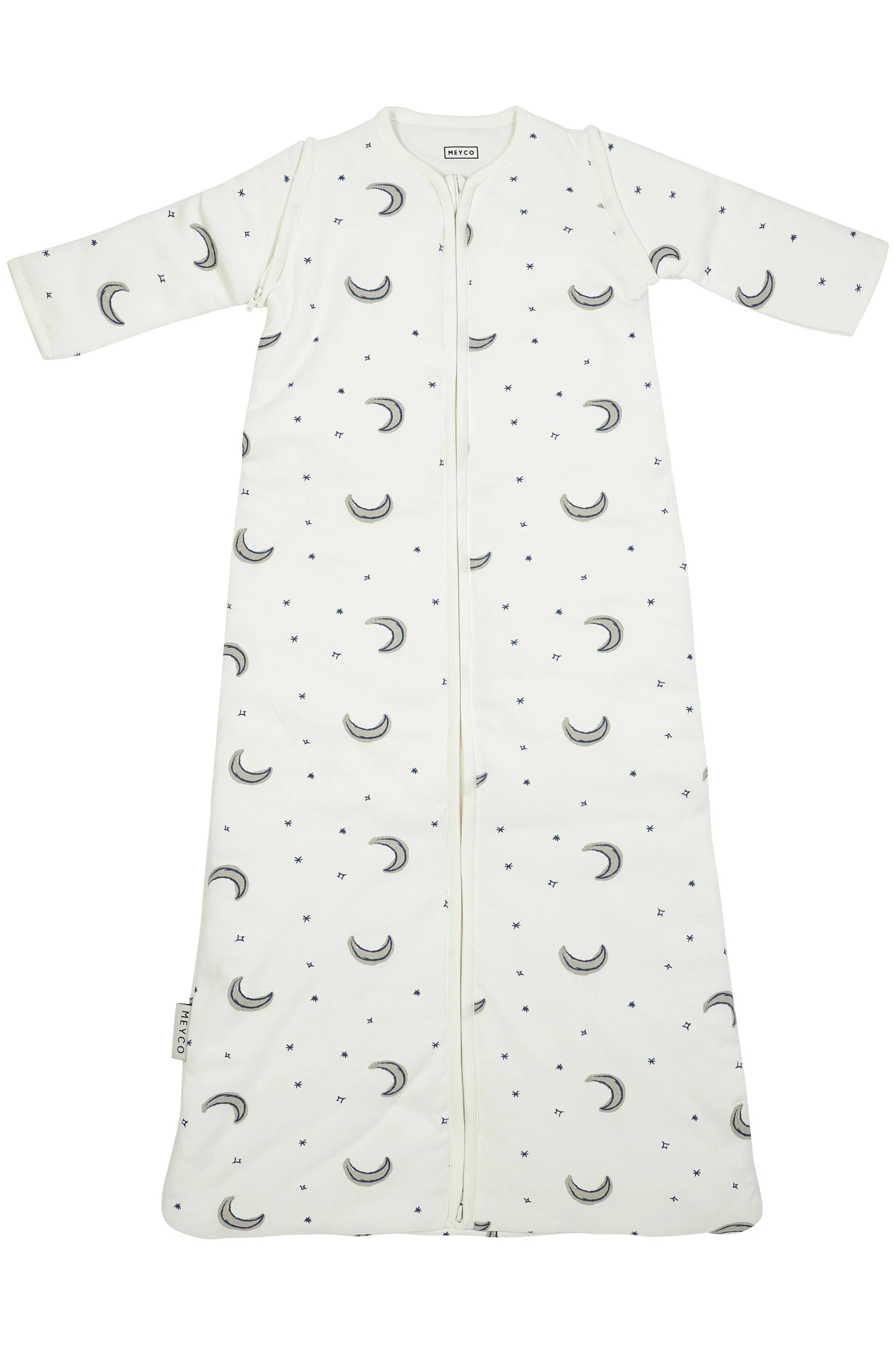 Laat je kleine dromer heerlijk in slaap vallen in de Meyco Baby slaapzak met afritsbare mouwen. Het slaapzakje is voorzien van de prachtige Moon print met mooie sterretjes en maantjes, zo slaapt je kindje heerlijk onder de sterrenhemel. Niet alleen leuk om te zien, want de slaapzak biedt jouw kindje ook heerlijk slaapcomfort. De winterslaapzak houdt jouw kleintje heerlijk comfortabel en warm tijdens de koude winterdagen en als je de mouwtjes er afritst, is de babyslaapzak ook fijn voor de zachtere voor- en najaarsnachten.