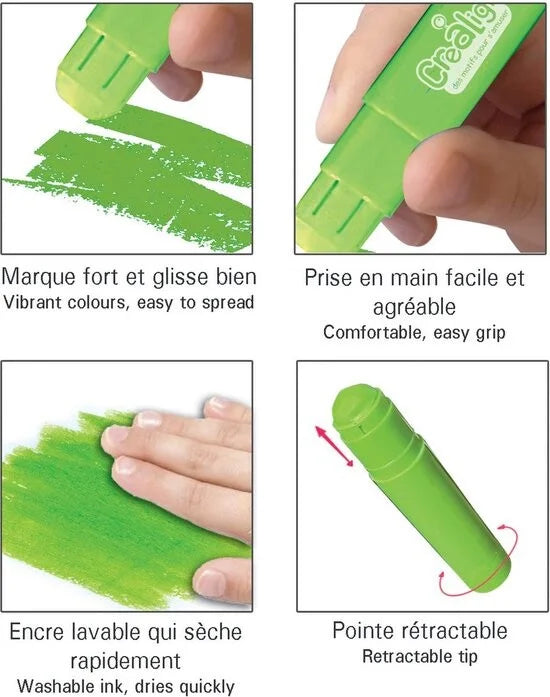 De inkt droogt snel en is ultra afwasbaar op de huid.Ideaal voor het stimuleren van de verbeelding en creatieve activiteiten van jonge kinderen. De gouachesticks hebben intrekbare tips. De kleuren zijn levendig en meer bedekkend dan waskrijtjes.