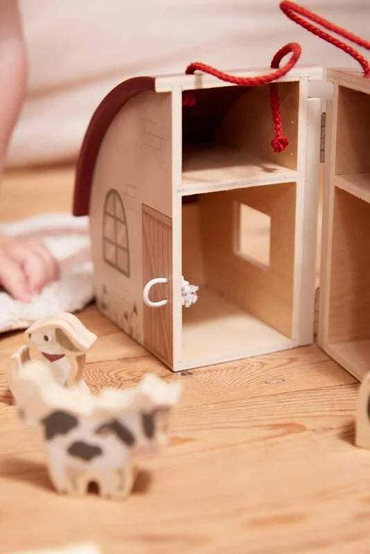 Er zijn uren plezier en leerzaam spel in de boerderij waar alleen de verbeelding de grenzen bepaalt. De houten boerderij wordt geleverd met handgrepen, zodat het gemakkelijk kan worden meegenomen als entertainment onderweg. De boerderij kan worden geopend en nodigt uit om zowel rond als in de boerderij te spelen.
